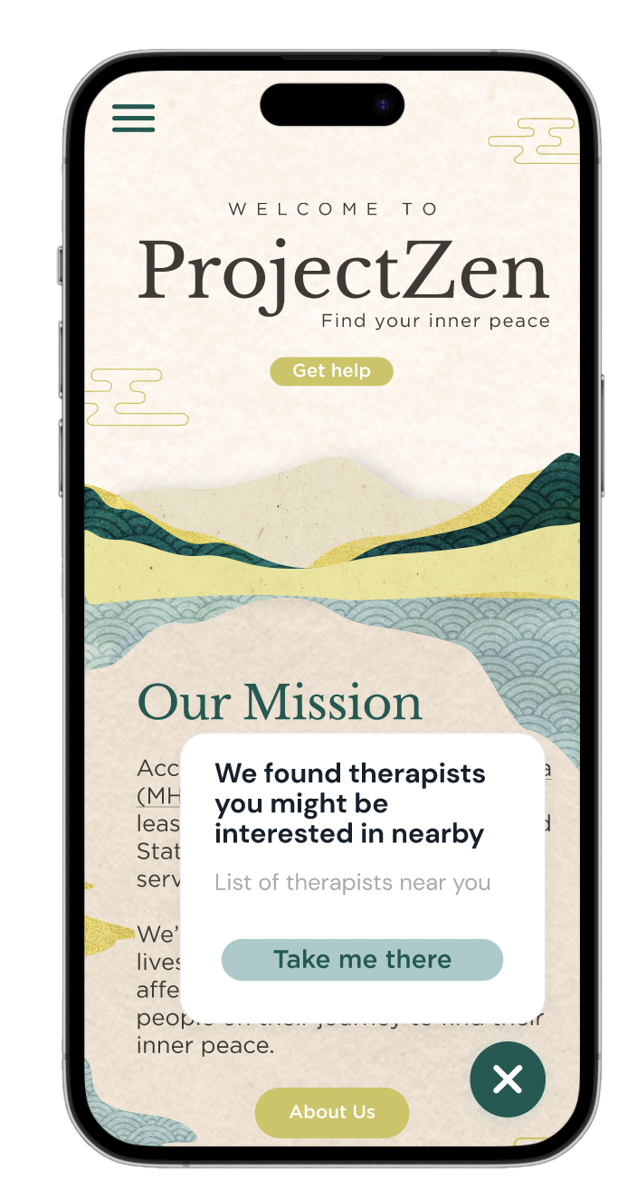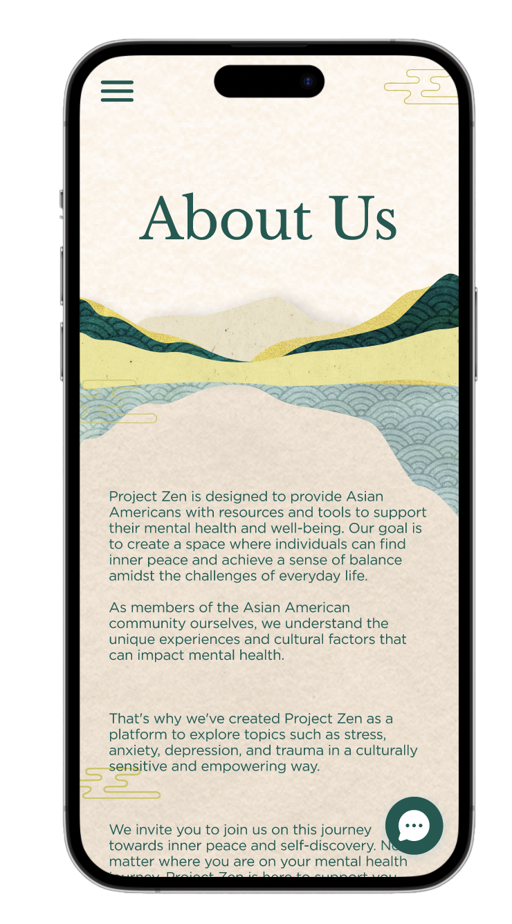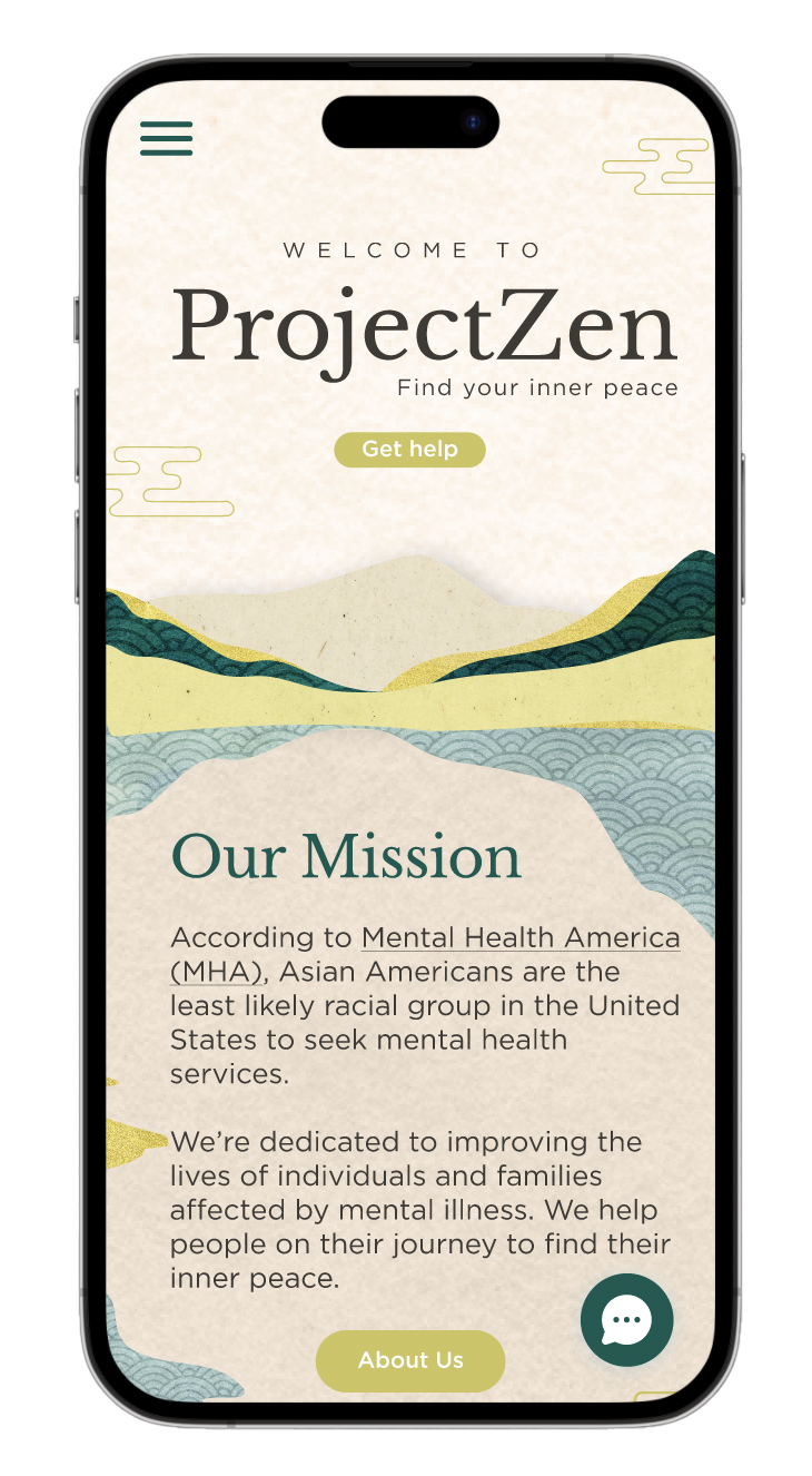 Project Zen stands as a powerful testament to the my commitment to social change and mental health advocacy. Focused on providing a vital resource for Asian Americans, the website integrates a chat feature that connects users with nearby therapists based on their responses. The comprehensive design process involved competitor analysis, heuristic evaluations, site-mapping, and the creation of a user flow. A new logo, featuring a crane symbolizing calmness and serenity, was crafted alongside soft paper textures and muted colors to evoke a tranquil aesthetic. The site was carefully prototyped and resized for optimal mobile web viewing, incorporating interactive button elements. Project Zen is not just a website; it’s a compassionate digital space designed to empower and support mental well-being within the Asian American community.
